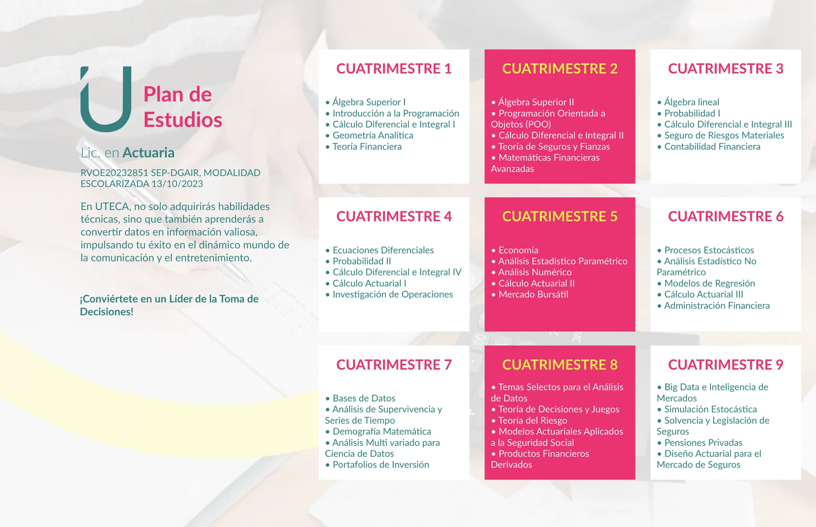 Nuestros licenciados en Actuaría son expertos en el análisis de riesgos y la gestión financiera. Dominan matemáticas, estadística, modelado financiero y herramientas informáticas para evaluar riesgos, diseñar planes financieros, determinar primas de seguros, calcular pensiones y asesorar en estas áreas. Estamos aquí para ayudarte