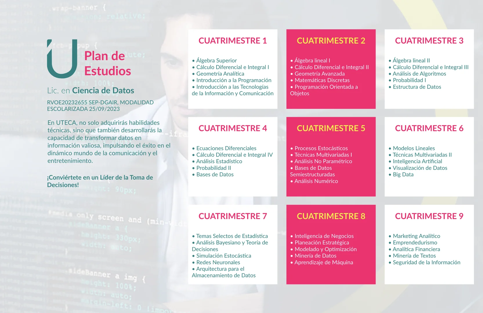 En UTECA, te ofrecemos una formación integral y avanzada que te prepara para sobresalir en el análisis de datos y la inteligencia artificial. Forma parte de esta nueva tendencia profesional; la Ciencia de Datos es un campo requerido en prácticamente cualquier industria.