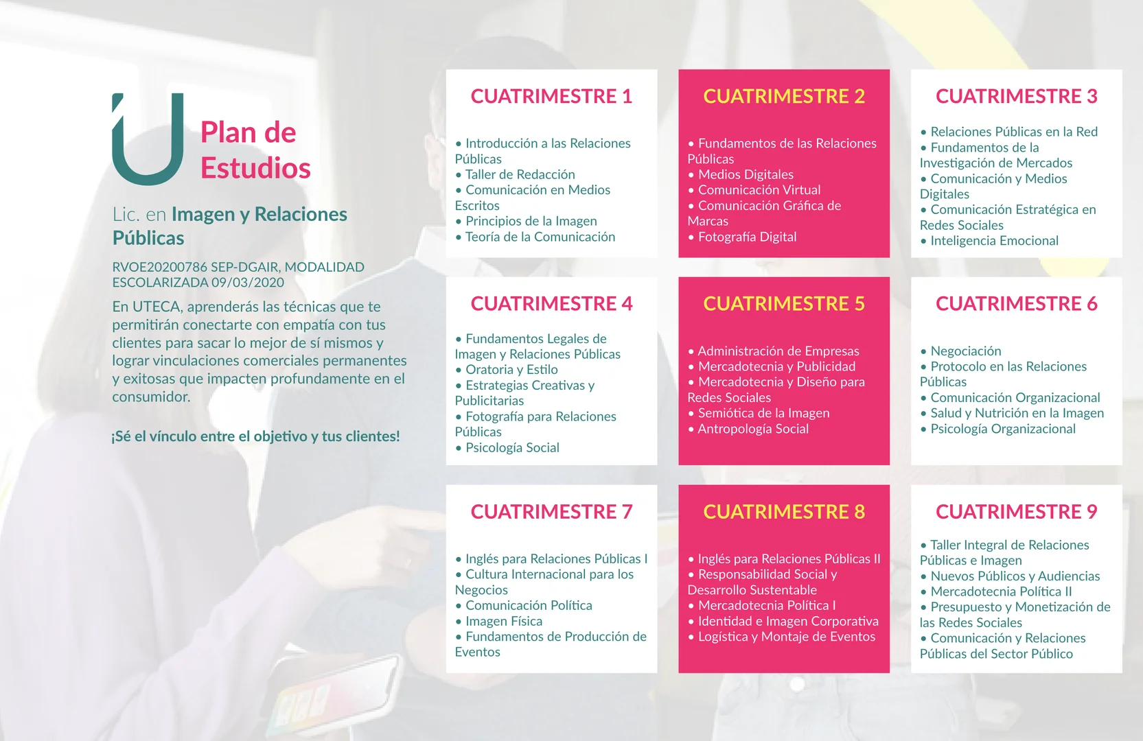 Nuestros licenciados en Imagen y Relaciones Públicas tendrán las bases para generar un impacto en la proyección exitosa de sus representados, mediante una comunicación efectiva y la capacidad de gestión de eventos que posicionen sus marcas.