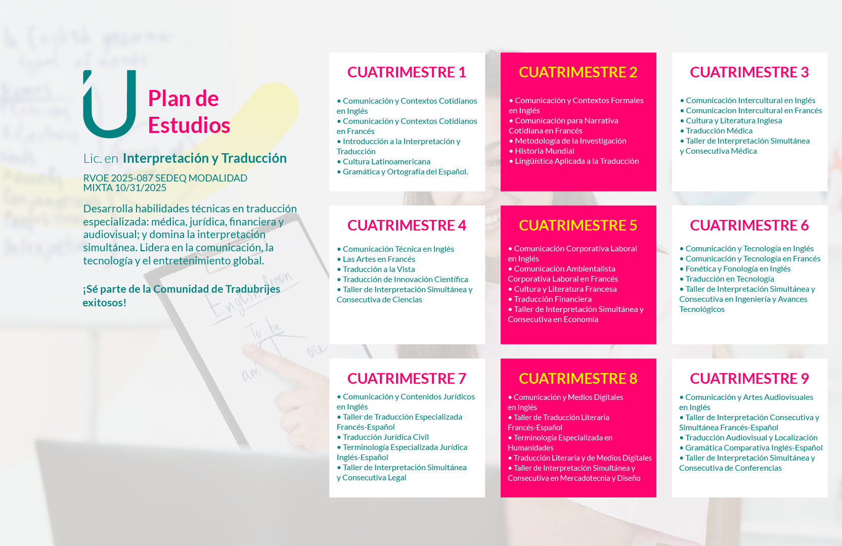 Conviértete en un experto en Interpretación y Traducción en Modalidad Mixta en UTECA Querétaro. Domina inglés y francés y accede a un mundo de oportunidades globales. Estamos aquí para ayudarte